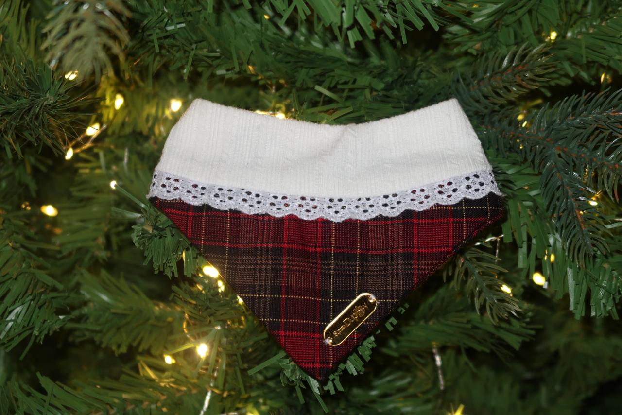 This bandana is crafted with a rich red-and-brown plaid fabric and finished with a delicate lace trim and cozy knit neckline — the perfect blend of holiday charm and timeless style.