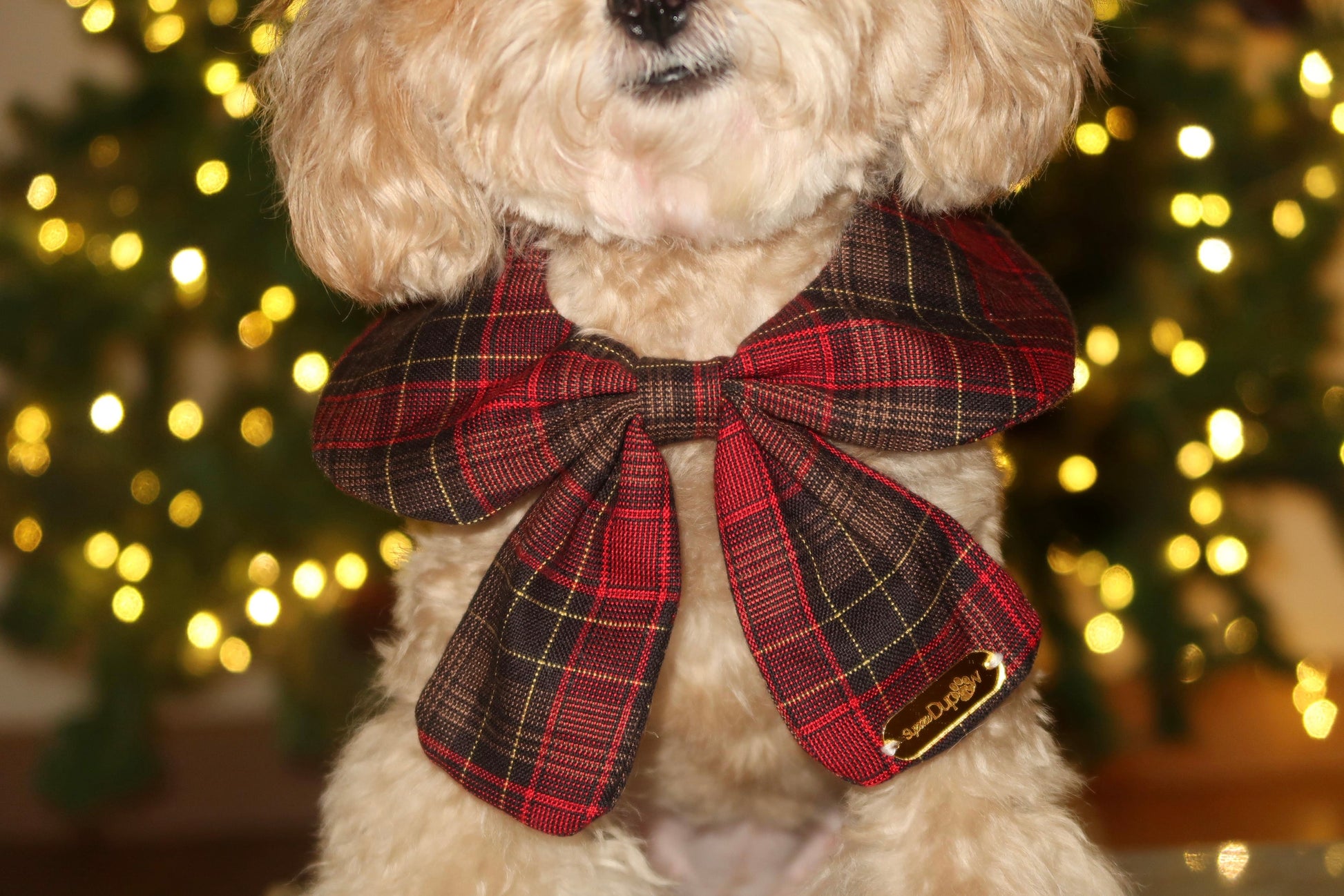 This bandana features a classic red-and-brown plaid pattern, crafted into a charming ribbon that adds just the right touch of festive elegance.